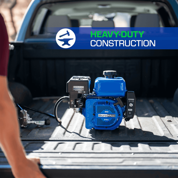 The DuroMax XP7HPX is a compact and lightweight Dual Fuel engine but don't let the size fool you. This 212cc 4-stroke OHV engine has plenty of POWER for multiple light duty applications including go karts, pressure washers, trailer-mounted mobile carwashes, log splitters, rototillers/cultivators, and water/trash transfer pumps. The XP7HPX comes equipped with a large 0.76 gallon gas tank, a propane hookup for flexibility and longer runtimes, a keyed electric start, and an E-Z pull recoil start. This engine is EPA and CARB approved for safe mandated use.