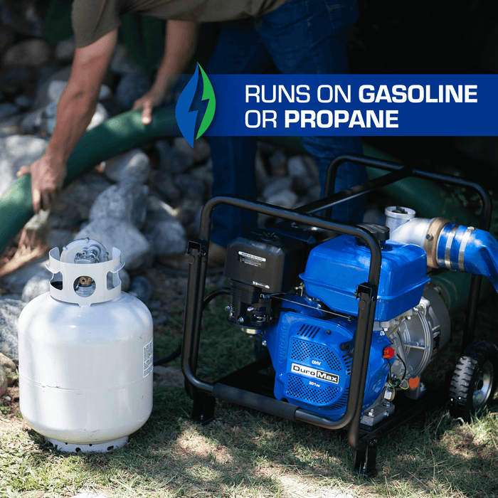 - Dual Fuel technology lets you run the water pump on gasoline or propane.