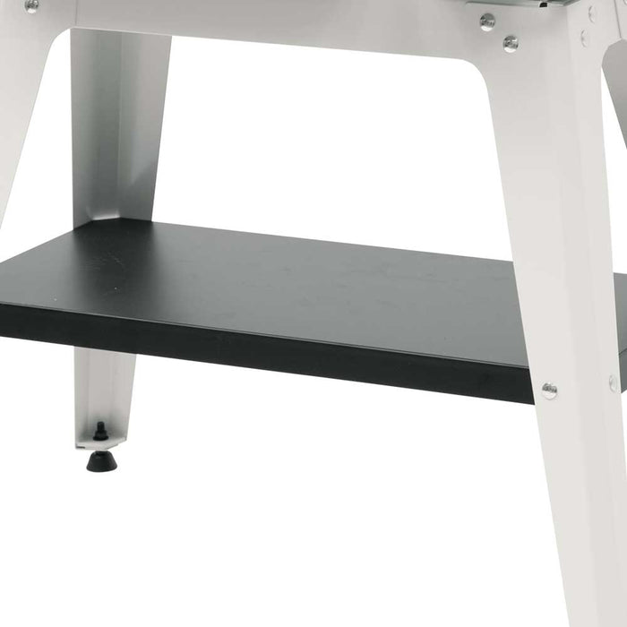 - Stand features a 20" x 37" footprint to increase stability and has a storage shelf and pre-drilled holes for casters