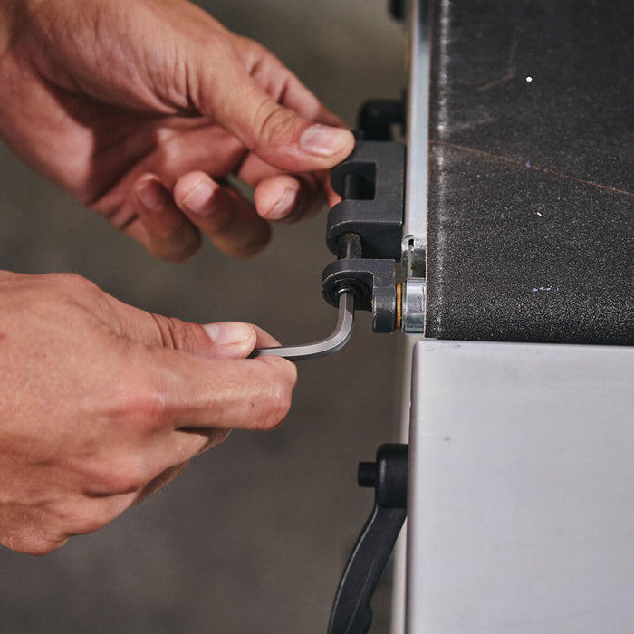 - Conveyor bed parallelism is easily adjusted by turning the dial on the outside of the bed - no tools required