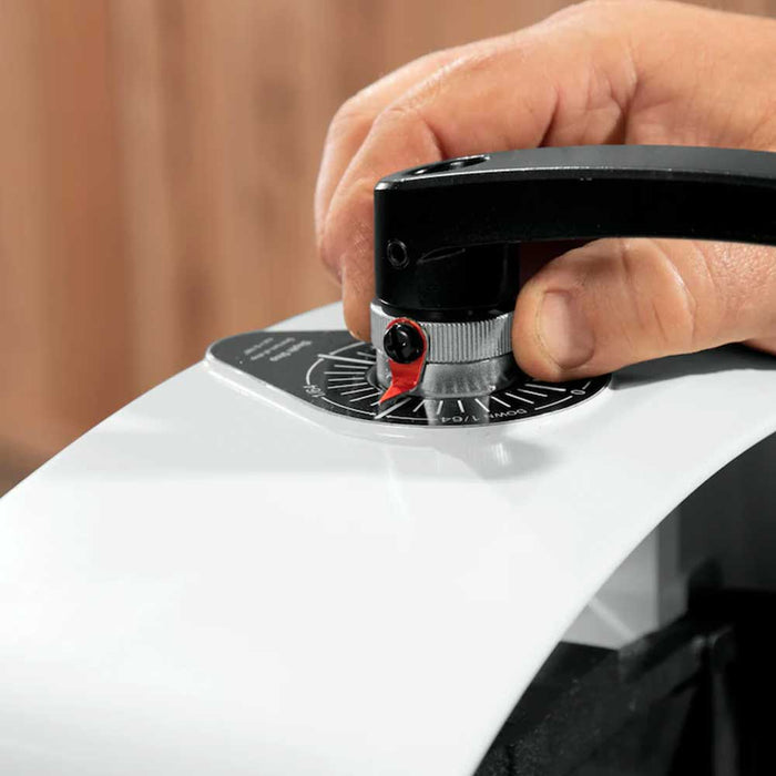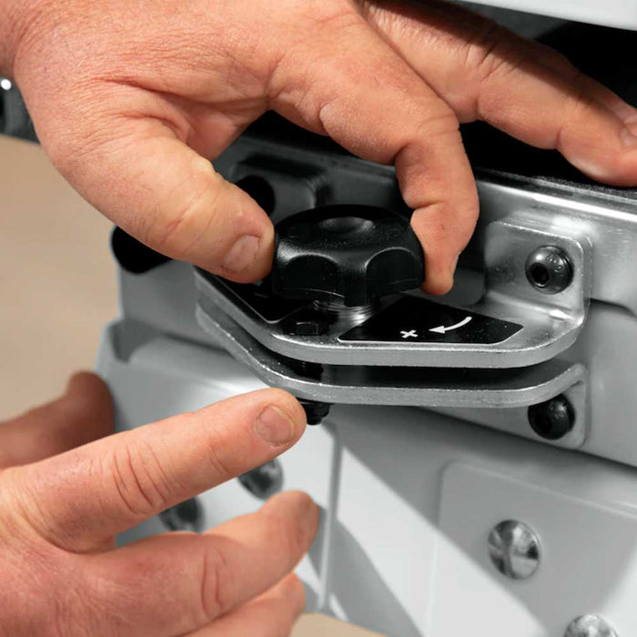 - Conveyor bed parallelism is easily adjusted by turning the dial on the outside of the bed - no tools required