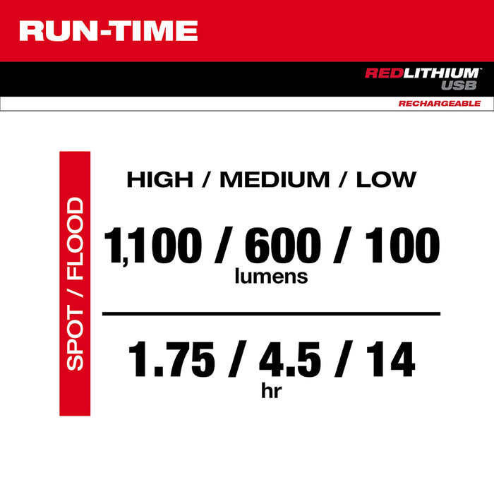 - 3 Light Output Modes: High mode: 1100-Lumens- 1.75 hours; Medium mode: 600-Lumens- 4.5 hours; Low mode: 100 -Lumens- 14 hours