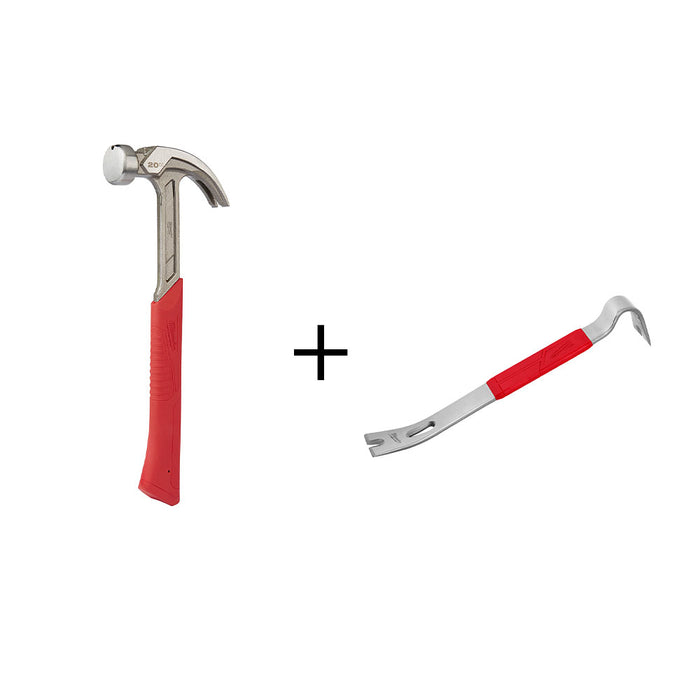 Milwaukee 48-22-9080PB 20oz Curved Claw Smooth Face Hammer w/ 15" Pry Bar