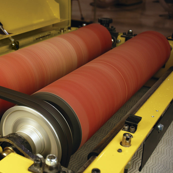- Hard durometer rubber coating on steel drums provides flat, smooth finish