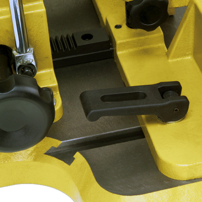 - Stock hold-down with a double lock system, top and side, to eliminate slippage of workpiece