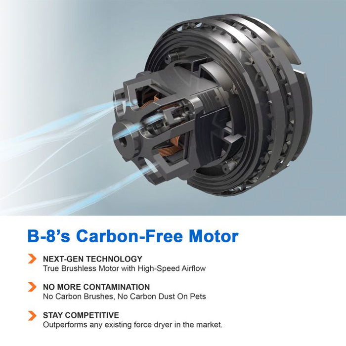 - Greatest Customer Satisfaction - The B-8 Elite is the only brushless force dryer that exists, equipped with a long-lasting motor that produces 0 carbon dust. Say no to contaminating pets’ coats and give the best service to pet owners today.