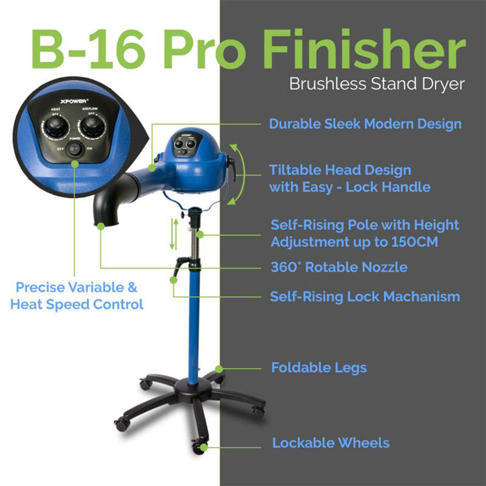 - Show Quality Results - The B-16 Pro Finisher is a feature-packed powerhouse of a stand dryer, producing the highest CFM in the market and equipped with both variable airflow and temperature controls to allow a precise and professional finish.